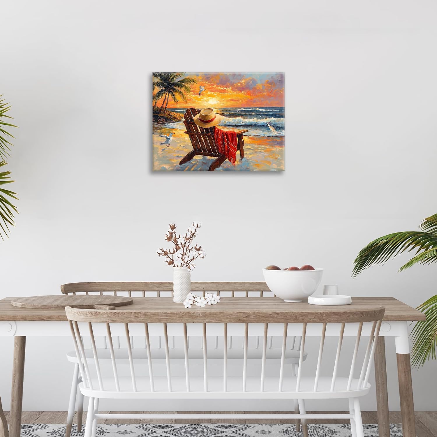 Beach Coastal Bathroom Pictures Wall Art, Seaside Ocean Bathroom Wall Decor, Sunrise Palm Framed Painting Canvas Artwork for Bedroom Living Room Decorations 20"L x 16"W