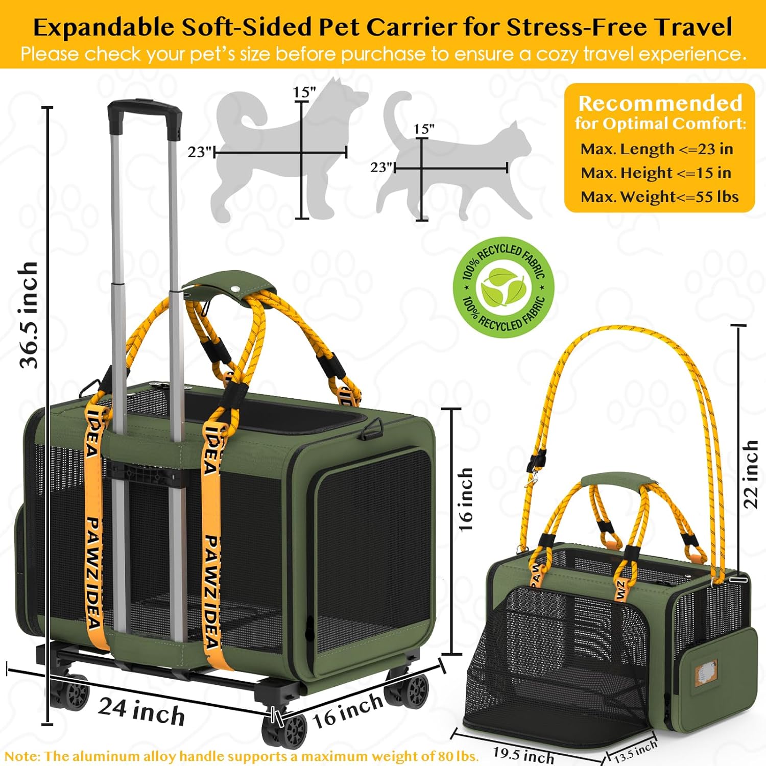 PAWZIDEA Expandable Pet Carrier with Wheels, 24x16x16in Large Cat Carrier for 2 Cats, Soft-Sided Dog Carriers for Small Medium Dog, Collapsible Rolling Travel Bag w/Telescopic Handle, XL Stroage Bag