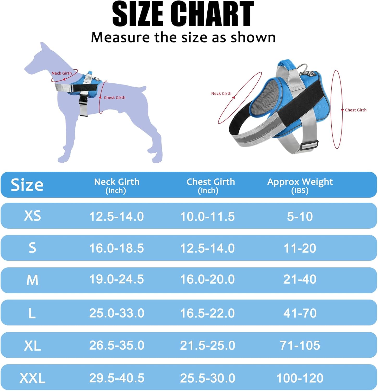 • EXTRA SMALL DOG HARNESS: ★Approx Weight: 5-10 lbs. Neck Girth: 10"-11.5", Chest Girth: 12.5"-18"★. It perfect for extra small dogs and pups, like Yorkie, Chihuahua, Pug, Maltese dog, etc.