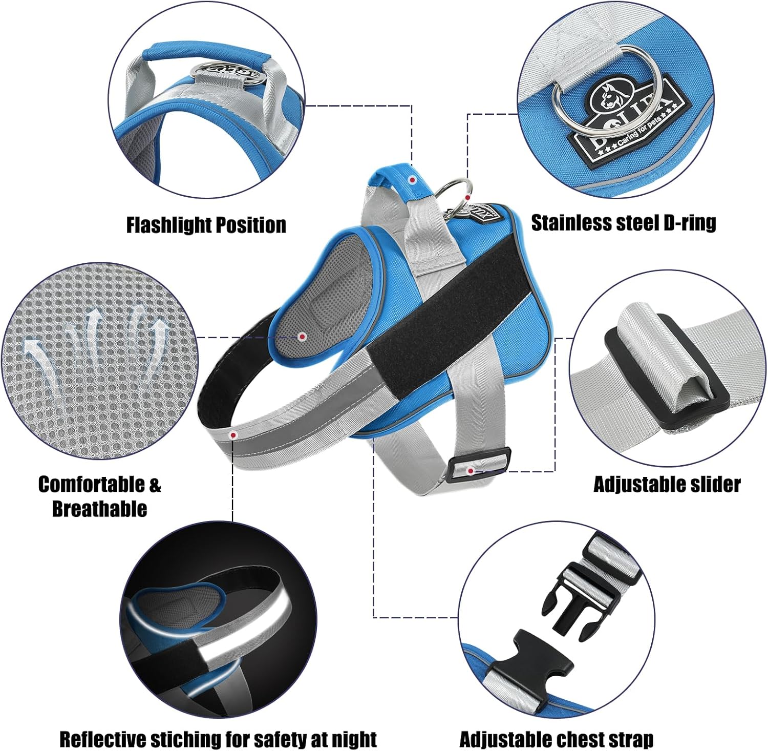 • STURDY HANDLE: The adjustable dog harness with rugged nylon handle further enhances your distance from the dog and is more intimate with each other. Easy on dog harness is also the best partner for dogs and is easy to control your dog.