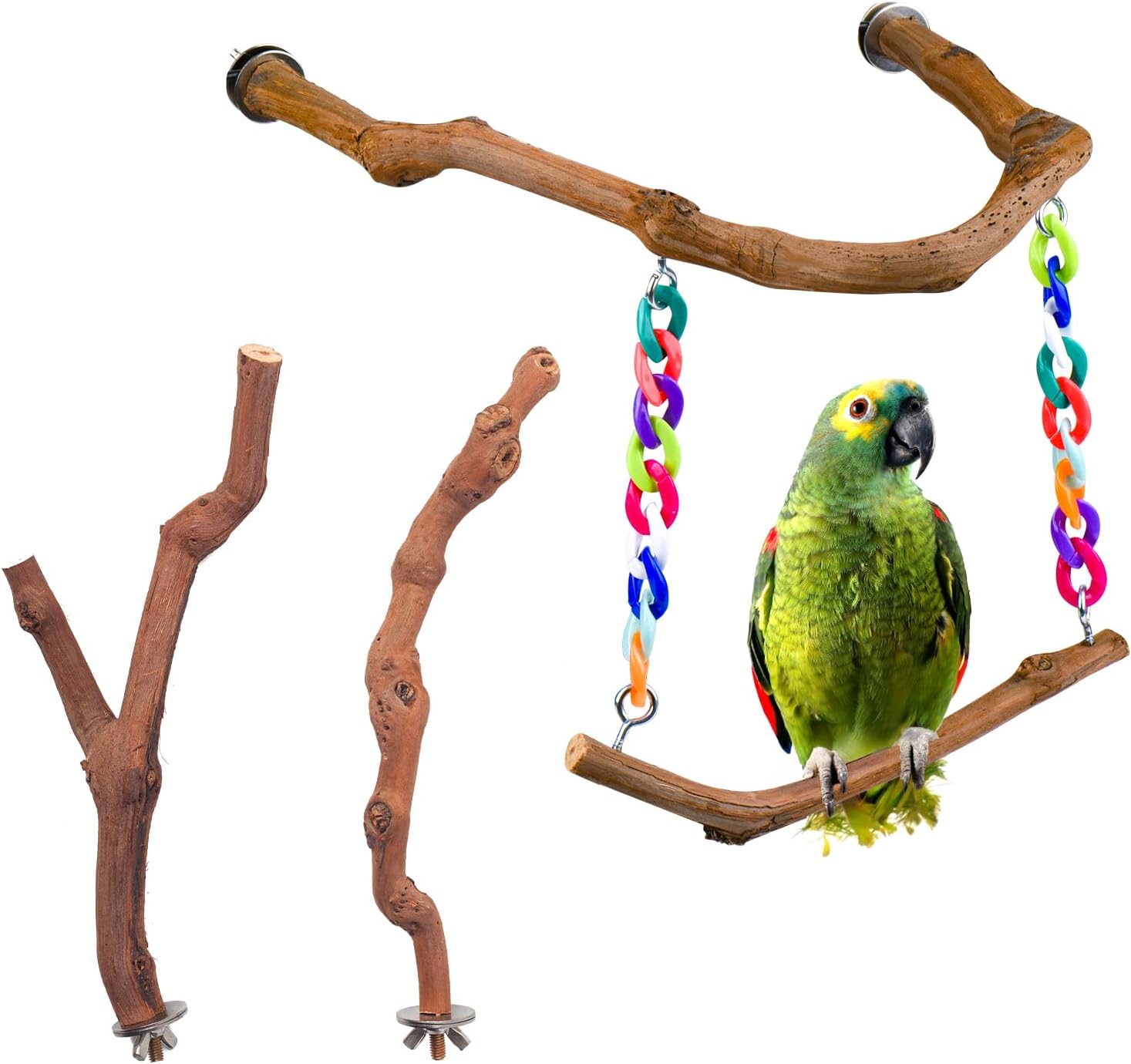 - 【Natural material】: The bird swing toy is made of natural grape wood. The surface is free of paint and wax, and the original texture protects the health of the bird's claws. Adorned with high - quality colored plastic chains, it can easily attract the attention of birds.