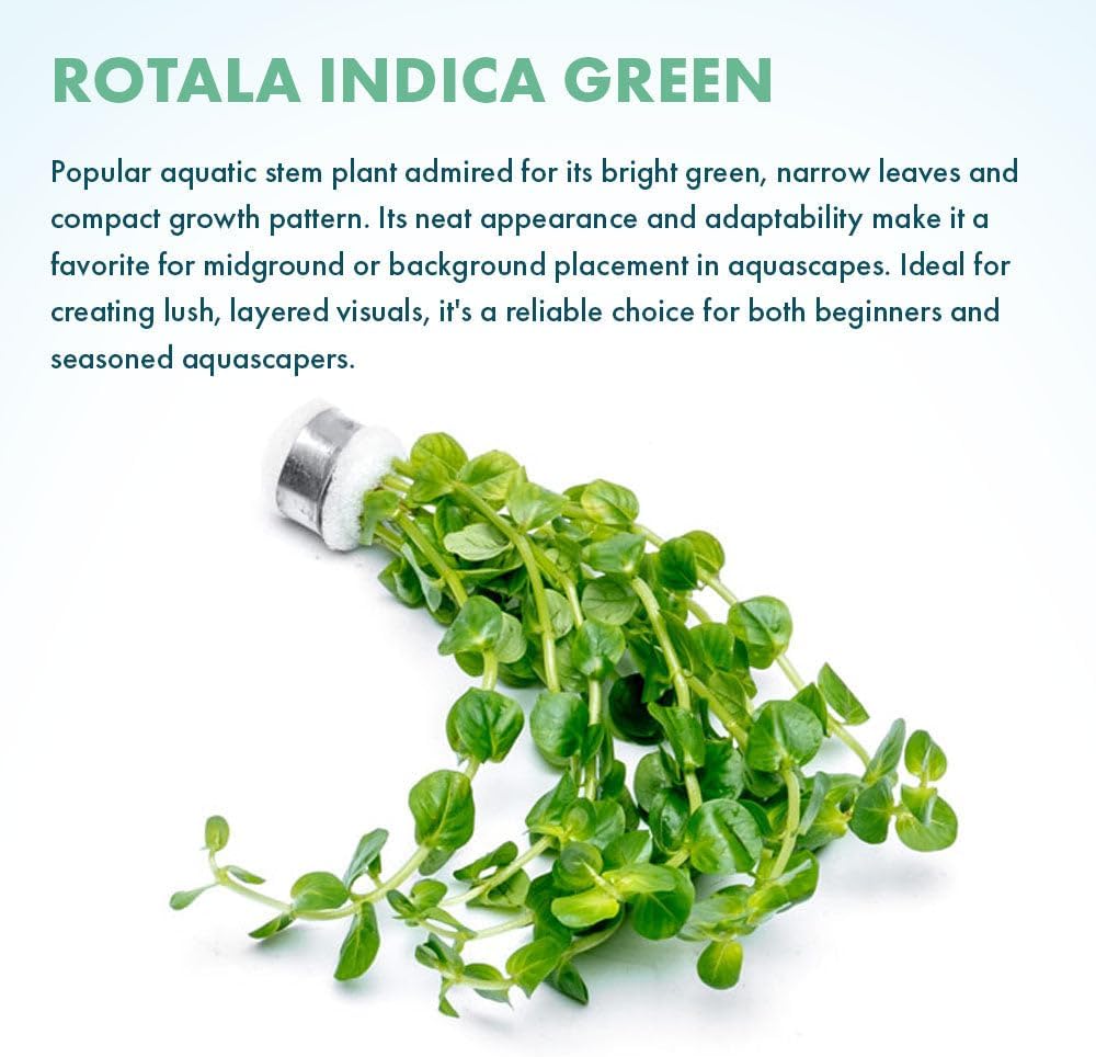 • Rotala Indica Green grows upright with bright green foliage and performs well in midground to background.