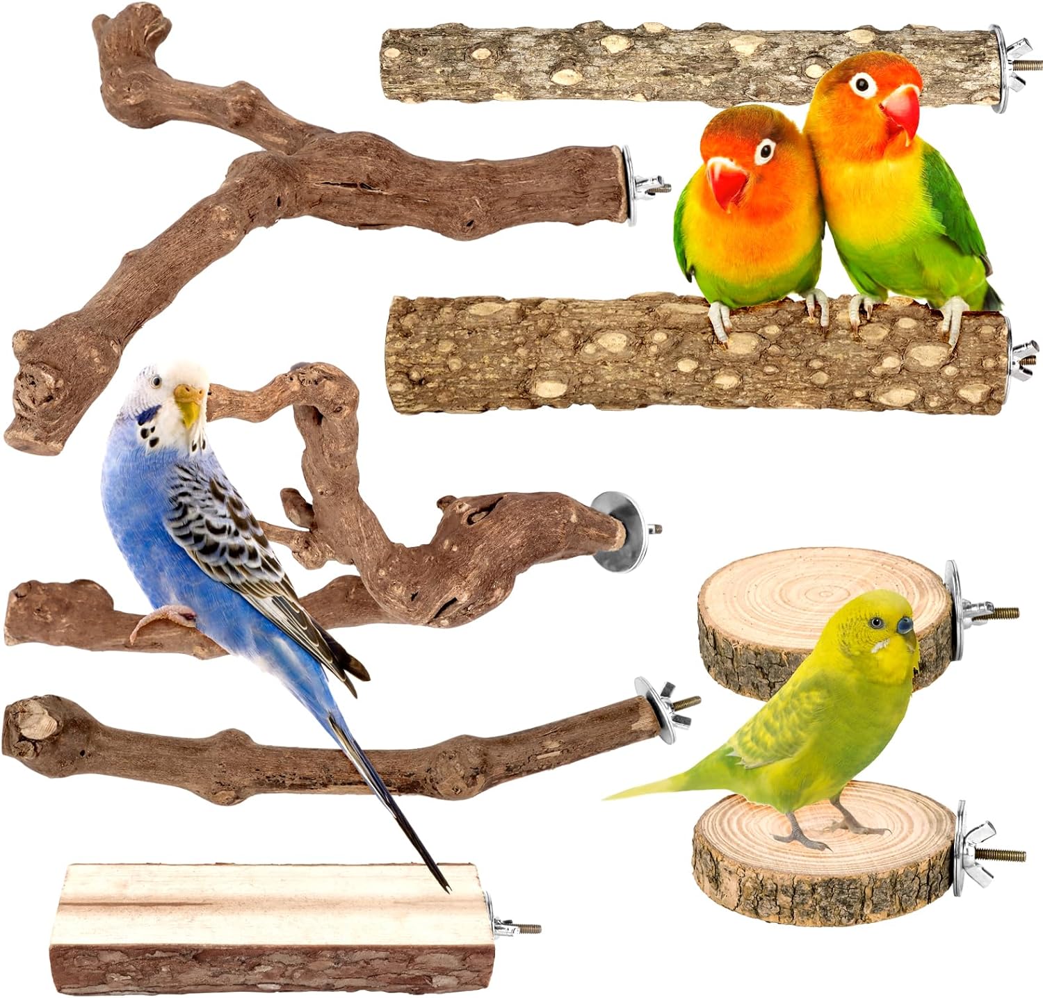 8PCS Natural Grape Wood Bird Perch Set - Parrot Cage Stand with Paw Grinding Forks, Chewing Sticks & Exercise Branches for Parakeets, Cockatiels, Conures, Budgies, Finches