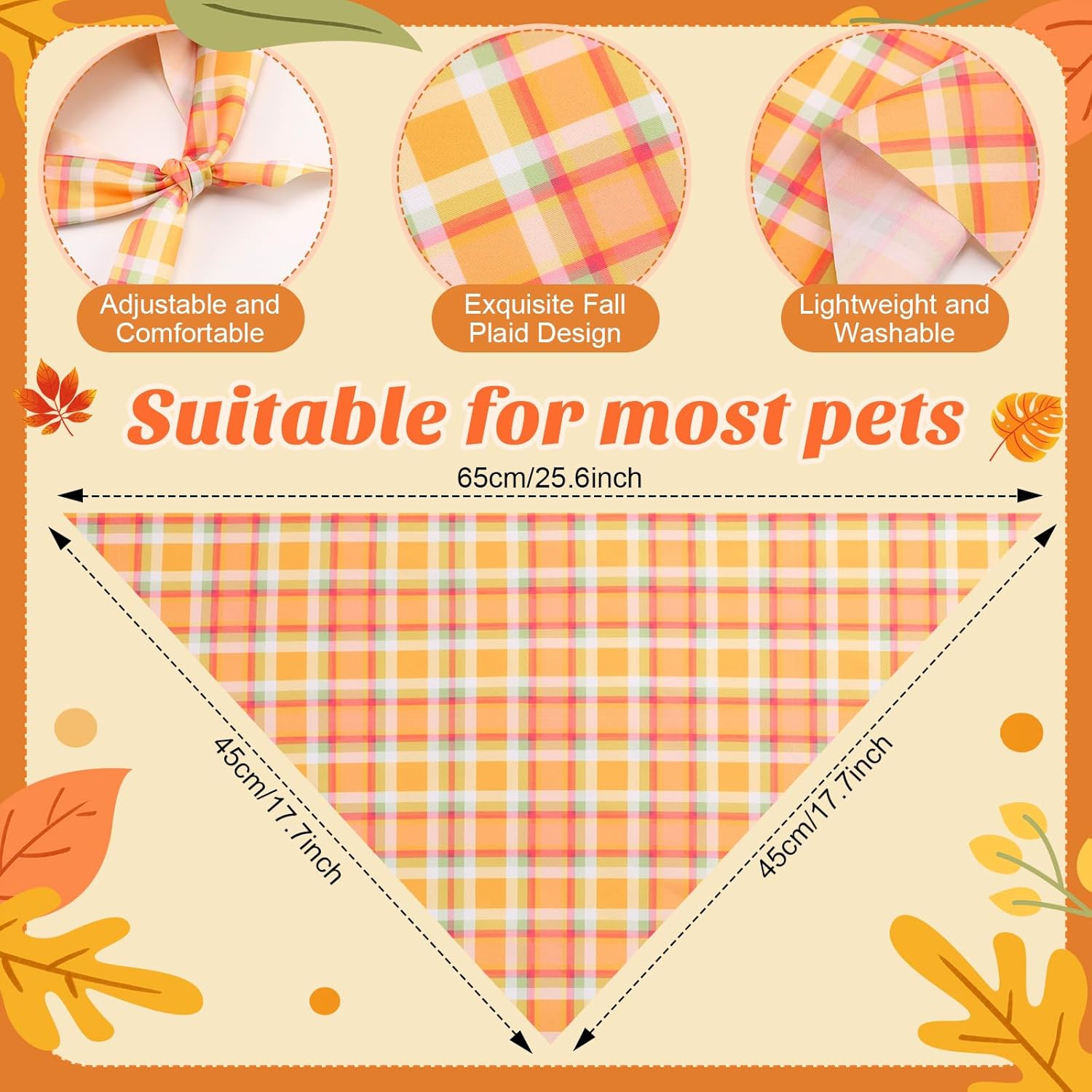 - Plaid Design: our Fall Dog Bandanas bulk are printed with a variety of orange Plaid designs, with bright colors and clear print, full of lively and active Autumn atmosphere, making your dog more charming in the crowd