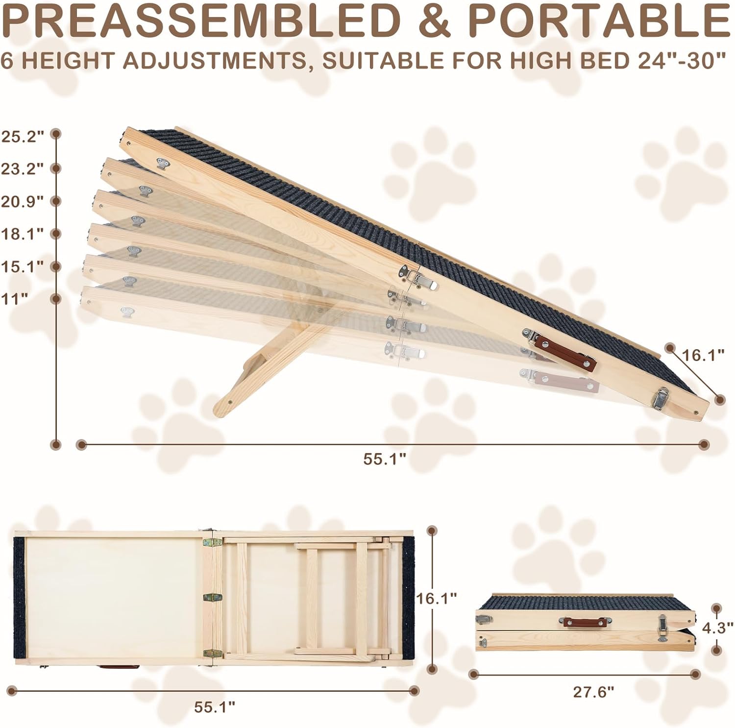 - Adjustable Height for Versatile Use βThe dog stair has 6 adjustable heights; Easily customize the ramp heigh from 11.02 to 25.2 inches to fit various heights, perfect for helping your small pets get on and down bed, sofa and car by simply adjusting the ramp height to your needs.