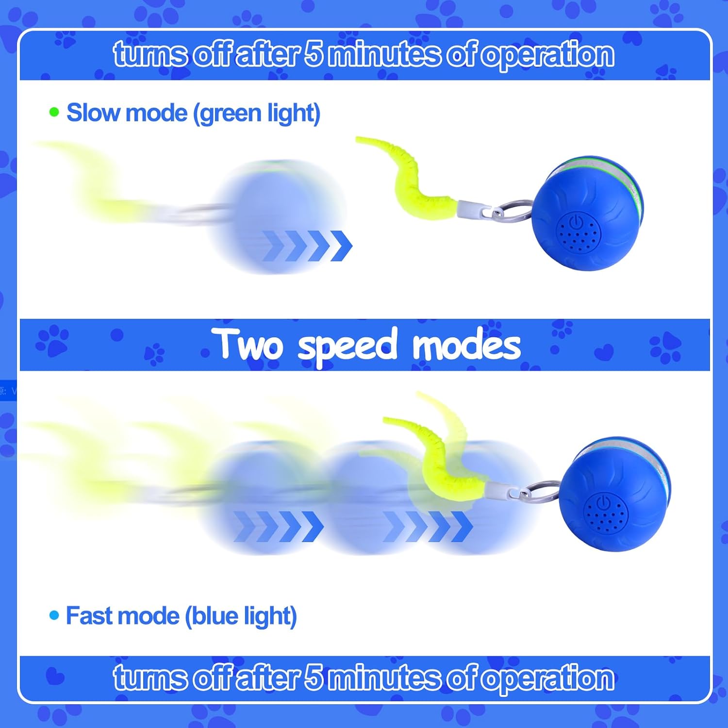 - Dual-Mode Smart Interaction: Speed cat ball toy designed with Normal Mode and Smart Mode, in Normal Mode the cat ball toy mimics natural behavior, moving randomly for 5 minutes before automatically stopping; in Smart Mode, the toy automatically enters standby mode after 5 minutes of activity, and can be reactivated by a cat's touch