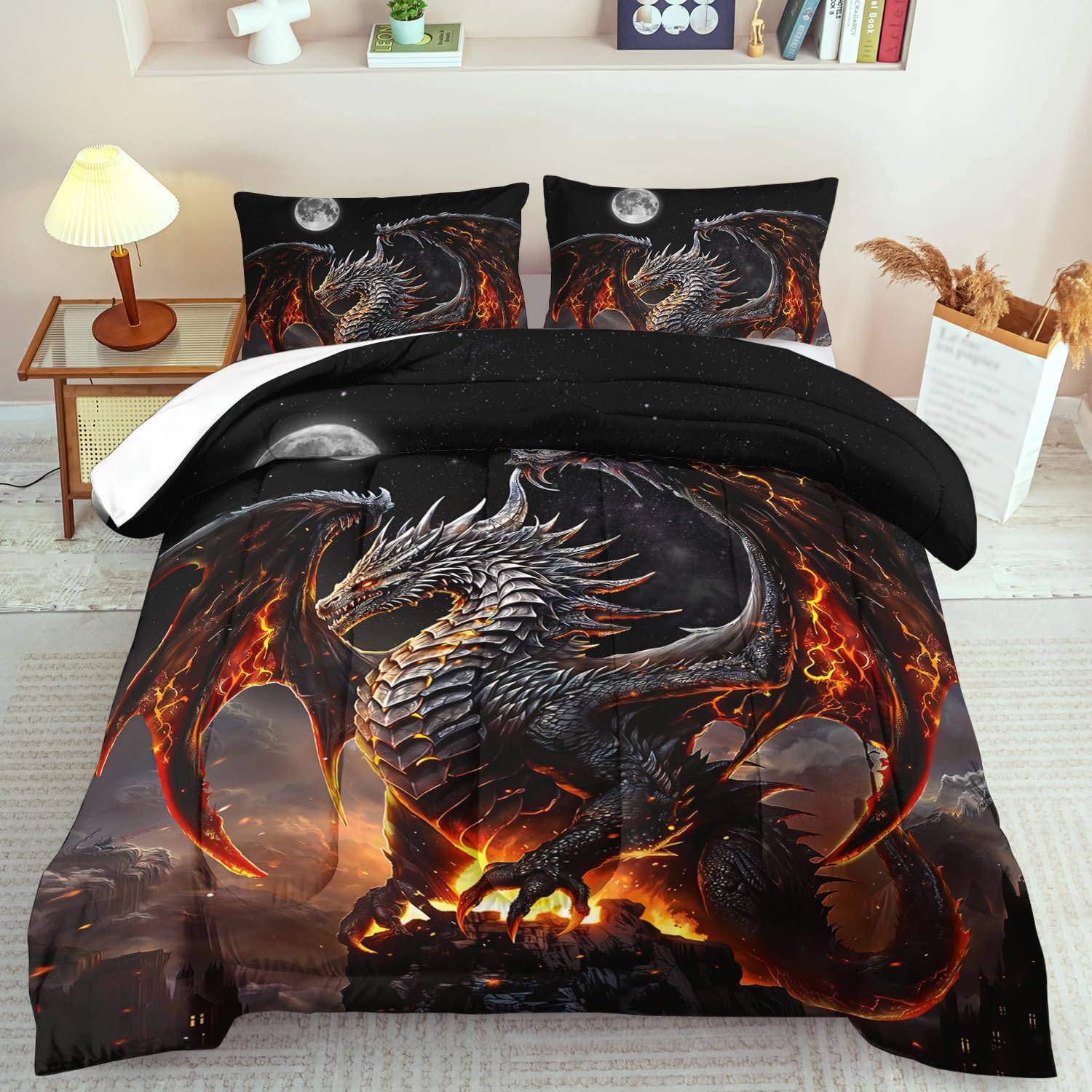 - Full Size Flame Dragon Comforter Set :This bedding set includes 1 comforter(67" x 85") and 2 pillowcases(20”x30”). In order to facilitate transportation, the quilt is made of vacuum compression technology. It will be slightly wrinkled when taken apart, but it will quickly regain its fluffiness if you gently beat it.