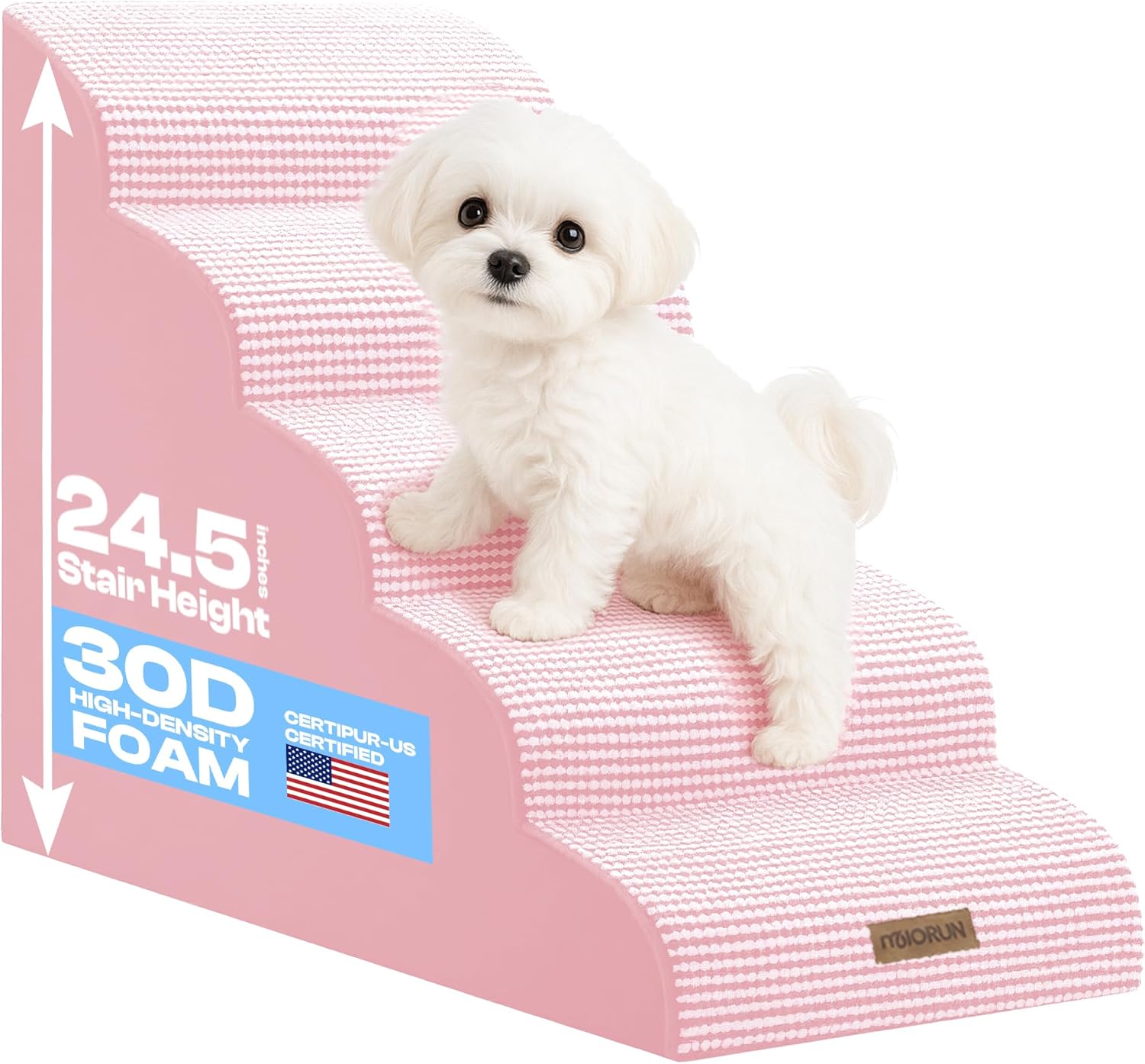 Curved Dog Stairs for High Bed Up to 26", 5-Step Dog Ramp for Small Dogs with Washable Cover, Non-Slip Steps for Cats to Get on Couch and Sofa, Durable Foam Ladder for Medium Breeds, White Pink