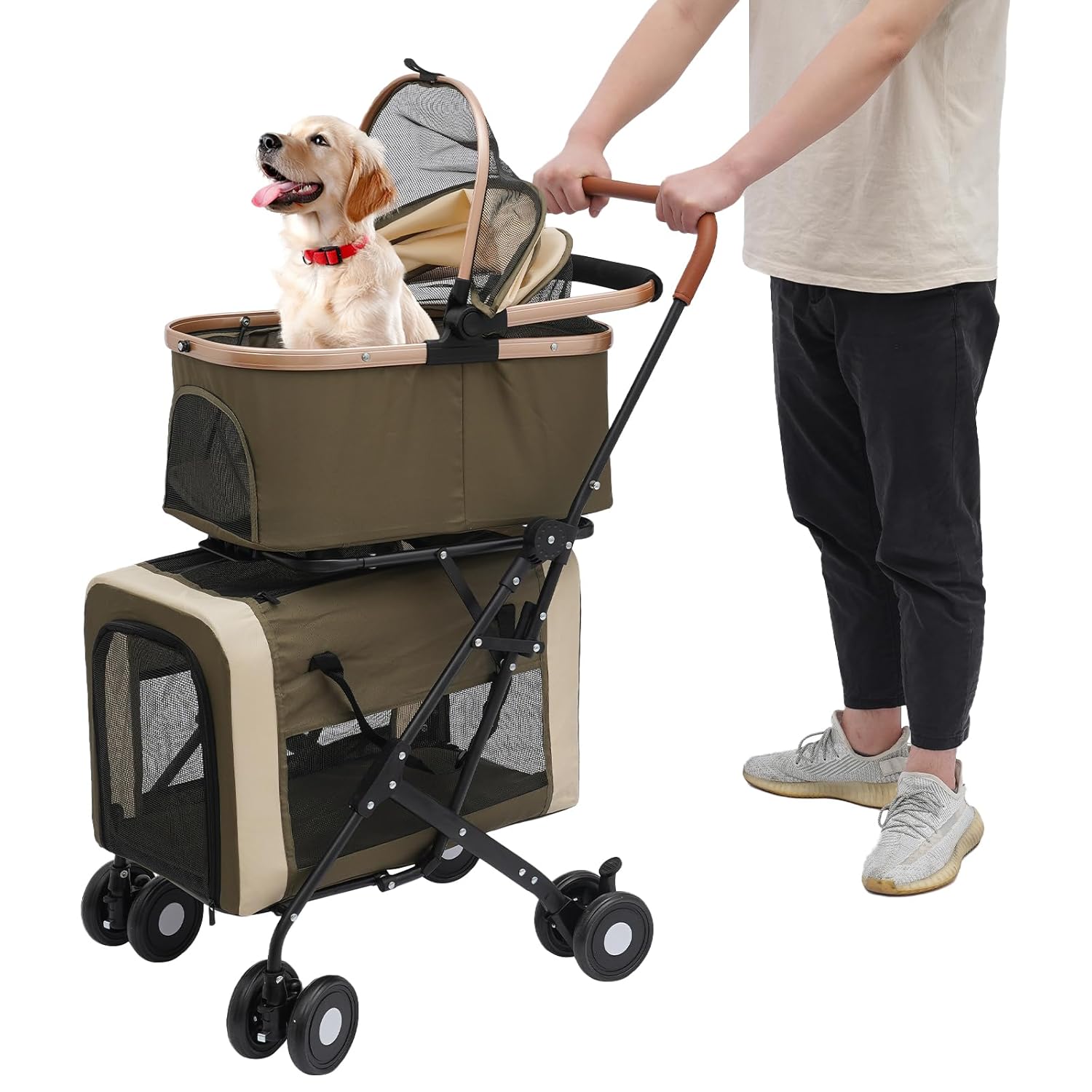 Double Pet Stroller for Dogs and Cats, Foldable Dog Stroller Travel Carriage with Detachable Carriers, Safety Belts, and 4 Lockable Wheels for Small to Medium Pets (Dark Green)