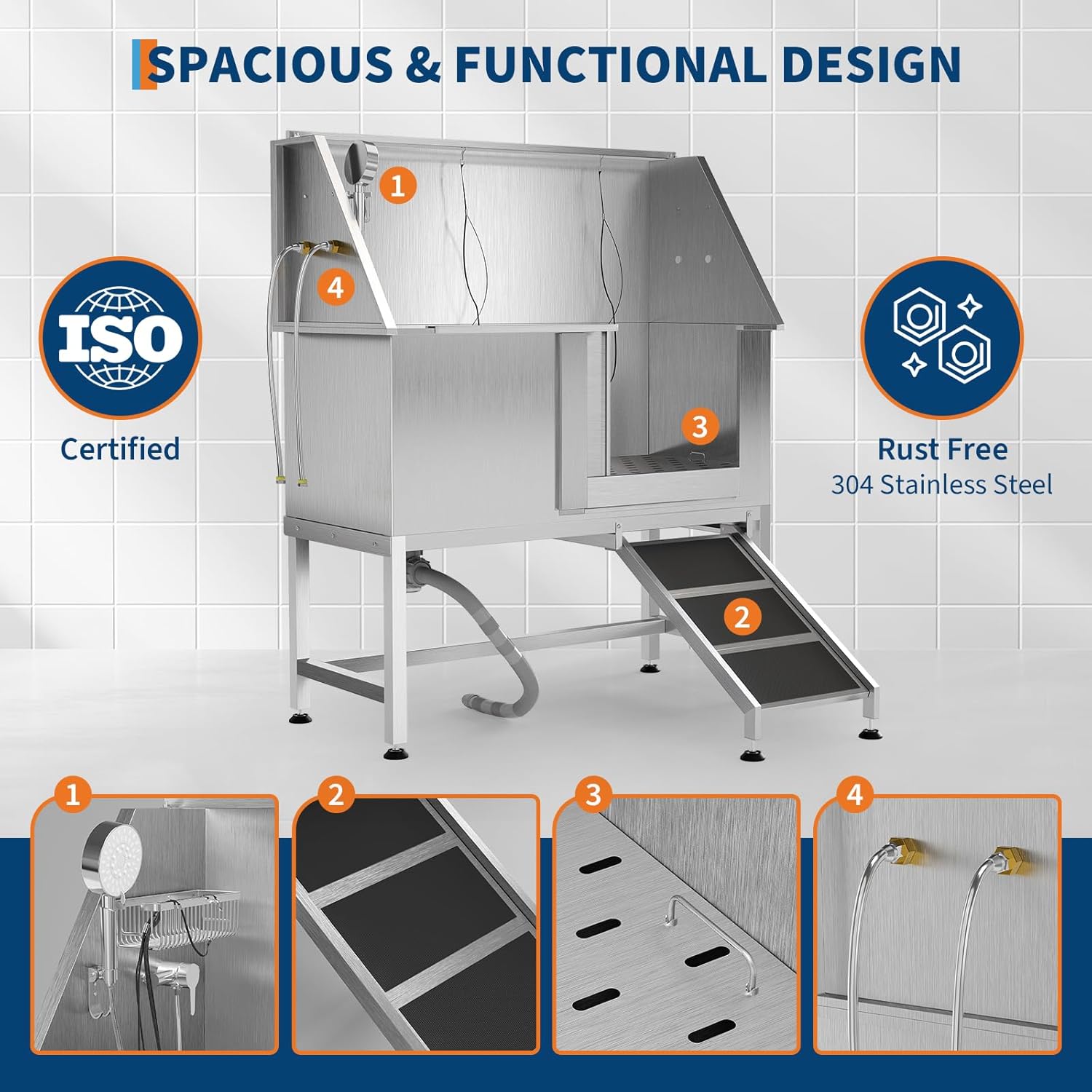 - Safety-Equipped Wash Tub Includes non-slip access ramp, storage cabinet, and locking gate mechanism to secure pets during bathing procedures.