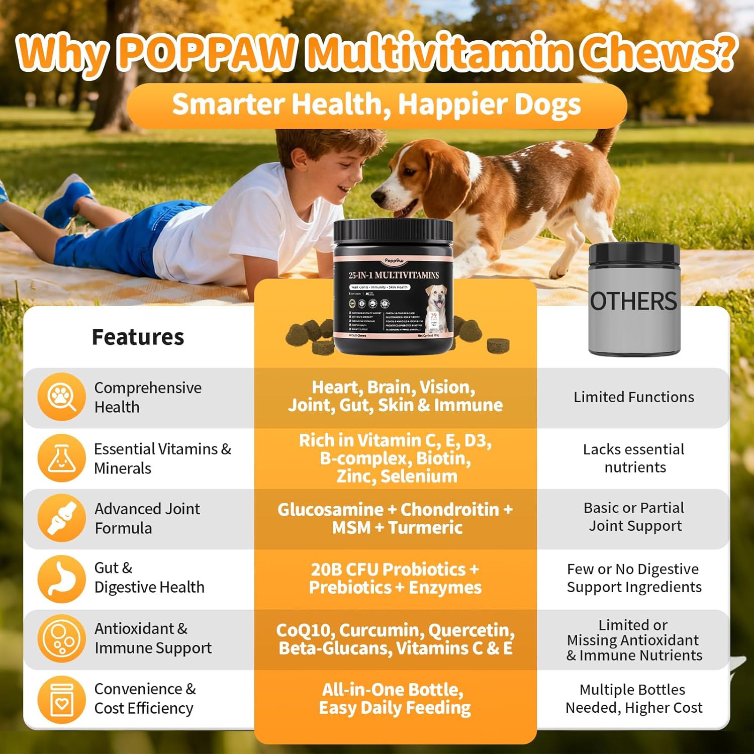 • 25-in-1 Daily Dog Multivitamin Chews: Comprehensive dog vitamins and supplements for skin & coat, joint health, heart, brain, digestion & immunity. Rich in Omega-3 fatty acids (DHA/EPA), vitamins, minerals & CoQ10 for daily vitality. Convenient, tasty soft chew for all breeds & life stages. Ideal daily multivitamin for dogs of all breeds and ages. Best results with continued daily use.