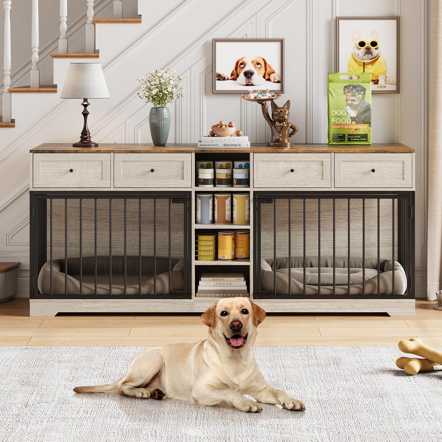 • Multi-functional Storage Options - This double dog crate with 2 large storage drawers to keep your pet's toys, clothes and other items neatly organized, 4 adjustable open storage compartments for storing dog food and other bulky items at will, a variety of storage methods to solve all your storage problems. The top surface provides ample space for placing decorations or items, dding a practical touch to its classic and simple design.